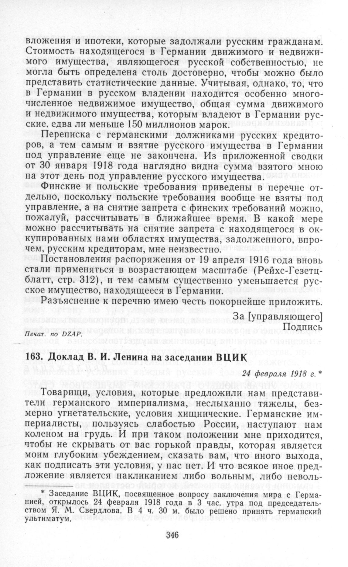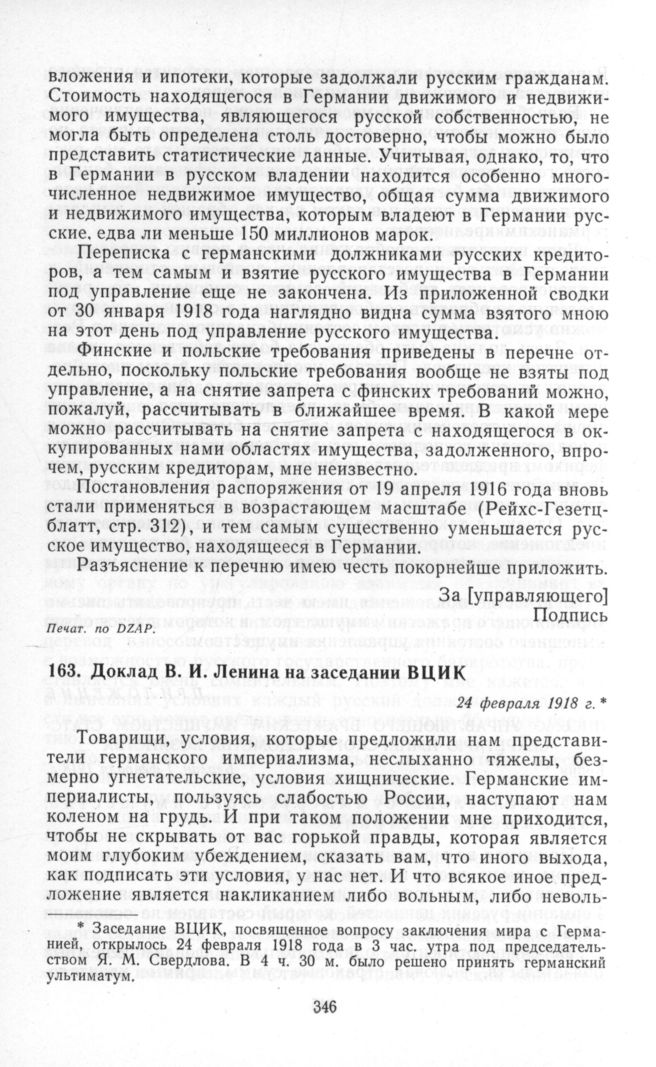 Доклад В. И. Ленина на заседании ВЦИК. 24 февраля 1918 г. // В. И. Ленин. Полное собрание сочинений, т. 35, стр. 376—380.