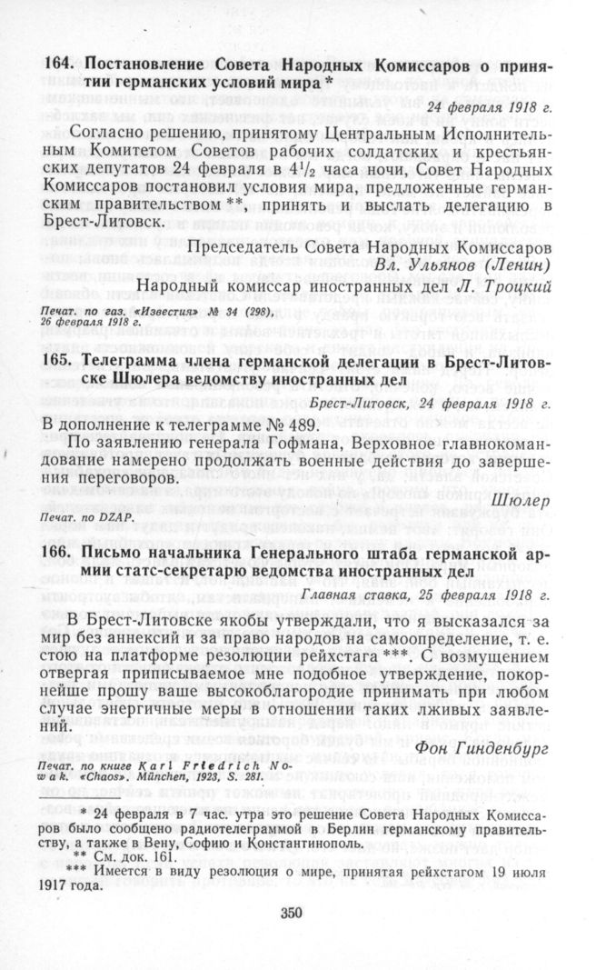 Постановление Совета Народных Комиссаров о принятии германских условий мира. 24 февраля 1918 г. // «Известия» № 34 (298), 26 февраля 1918 г.