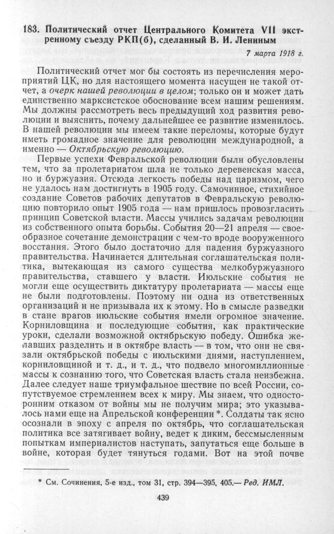 Политический отчет Центрального Комитета VII экстренному съезду РКП(б), сделанный В. И. Лениным. 7 марта 1918 г. // В. И. Ленин. Полное собрание сочинений, т. 36, стр. 3—26.