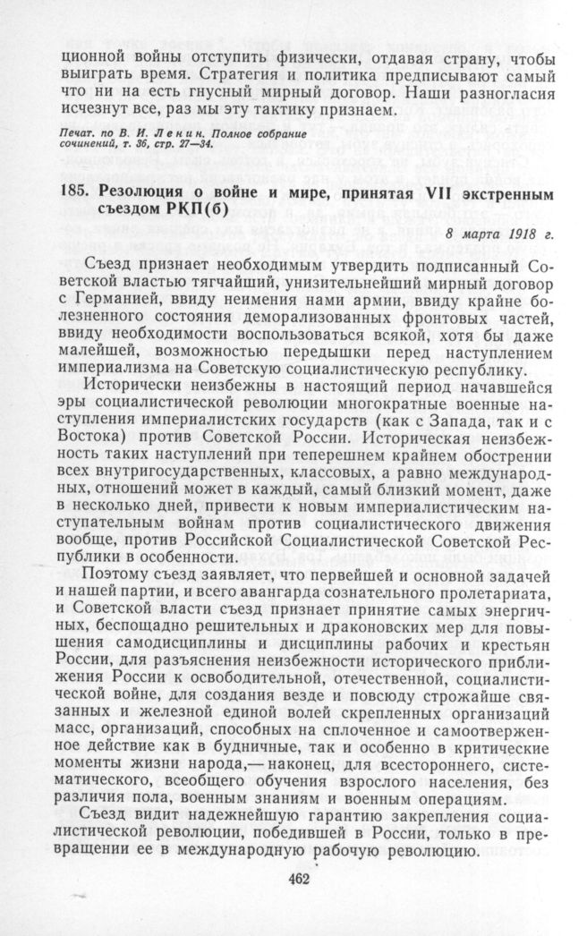 Резолюция о войне и мире, принятая VII экстренным съездом РКП(б). 8 марта 1918 г. // В. И. Ленин. Полное собрание сочинений, т. 36, стр. 35—36.