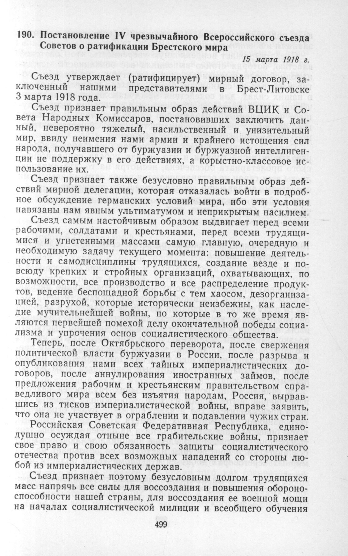 Постановление IV чрезвычайного Всероссийского съезда Советов о ратификации Брестского мира. 15 марта 1918 г. // «IV чрезвычайный Всероссийский съезд Советов». Стеногр. отчет, ГИЗ, 1920, стр. 56-57.