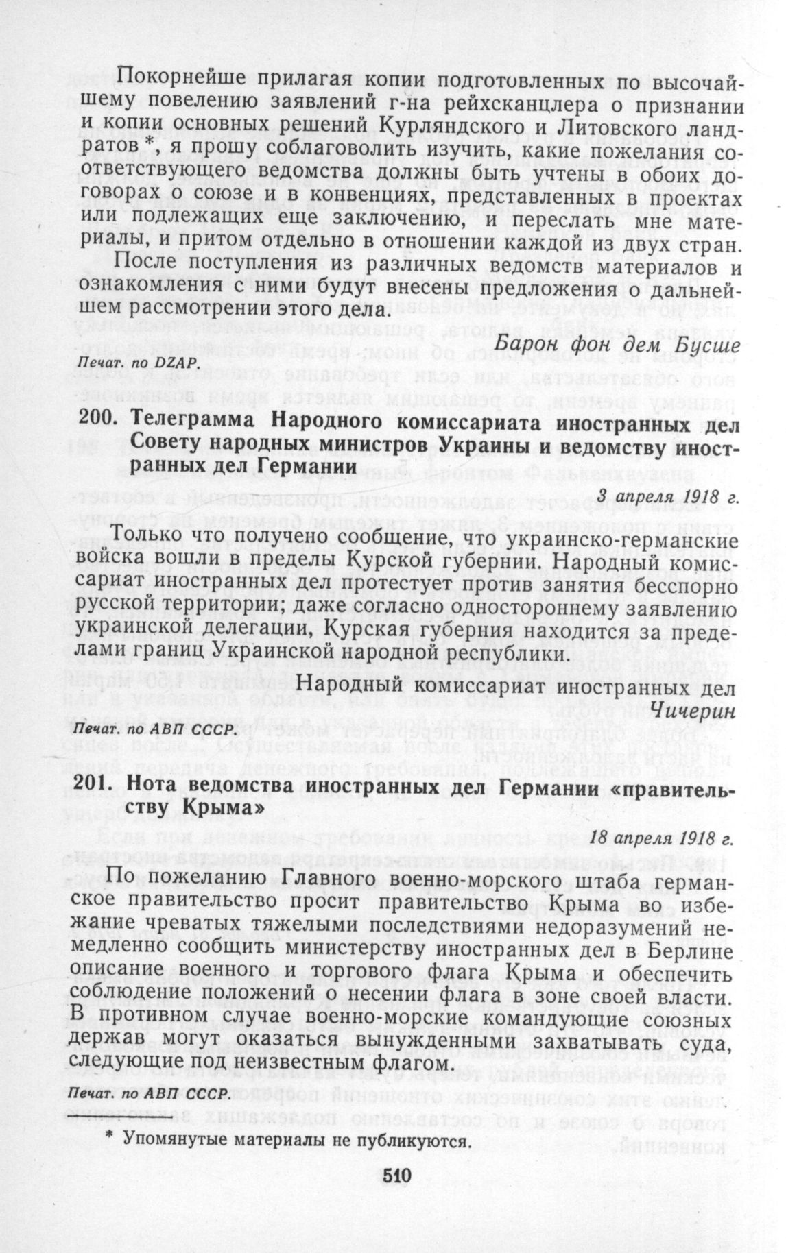 Телеграмма Народного комиссариата иностранных дел Совету народных министров Украины и ведомству иностранных дел Германии. 3 апреля 1918 г. // Печат. по АВП СССР.