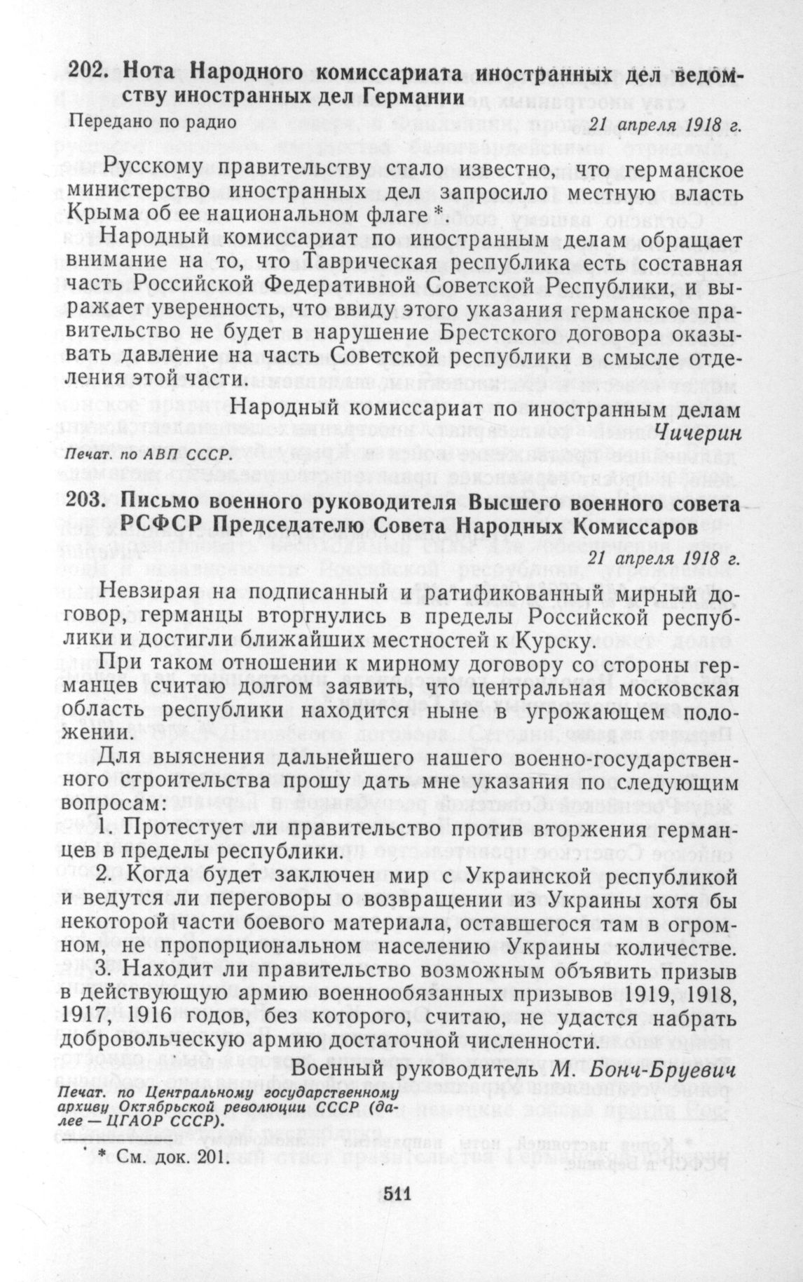 Письмо военного руководителя Высшего военного совета РСФСР Председателю Совета Народных Комиссаров. 21 апреля 1918 г. // Печат. по Центральному государственному архиву Октябрьской революции СССР.