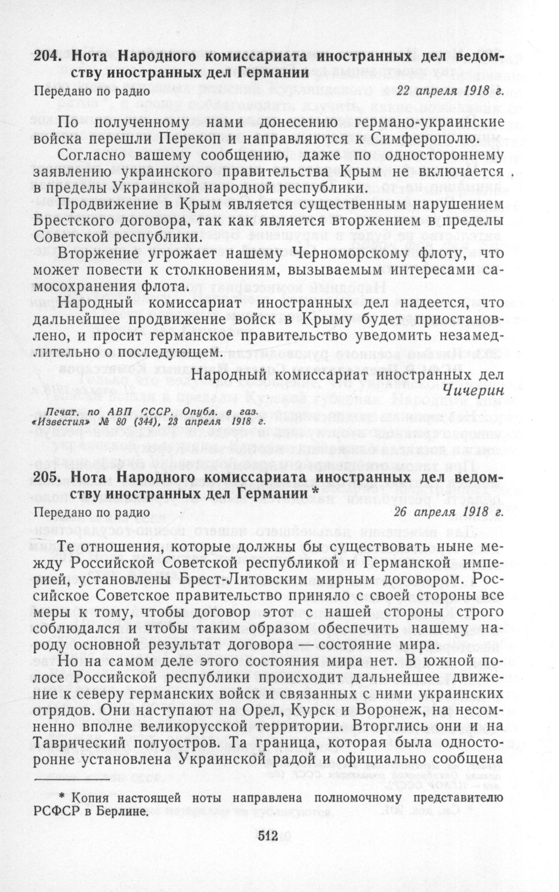 Нота Народного комиссариата иностранных дел ведомству иностранных дел Германии. 26 апреля 1918 г. // Печат. по АВП СССР.