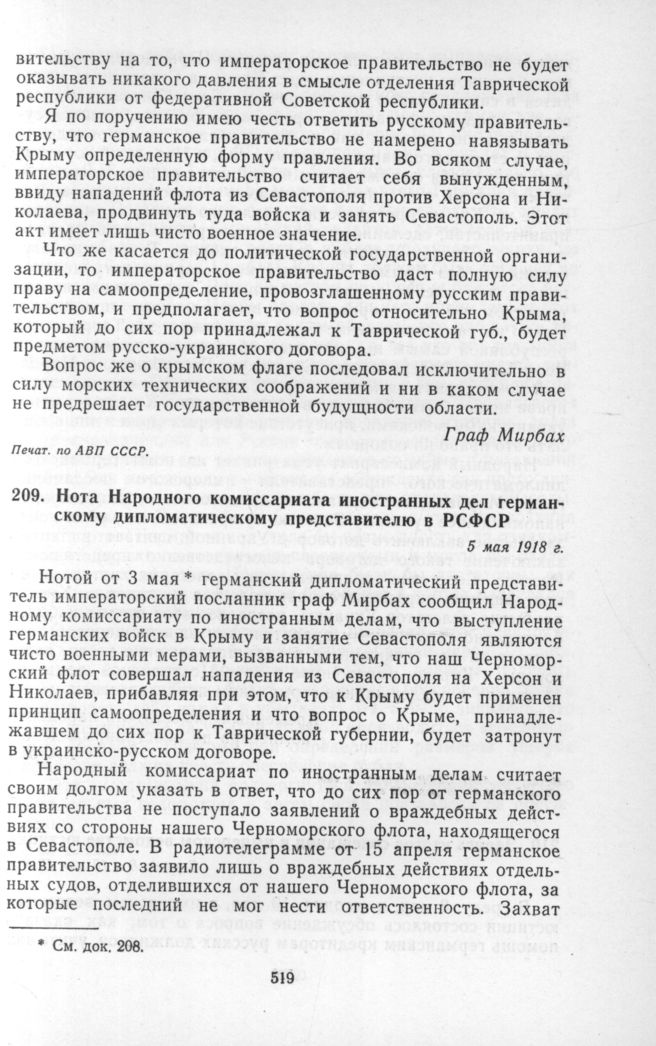 Нота Народного комиссариата иностранных дел германскому дипломатическому представителю в РСФСР. 5 мая 1918 г. // Печат. по АВП СССР.; «Правда» № 89, 10 мая 1918 г.