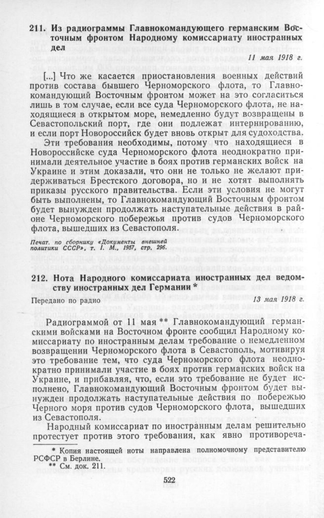 Нота Народного комиссариата иностранных дел ведомству иностранных дел Германии. 13 мая 1918 г. // Печат. по АВП СССР.