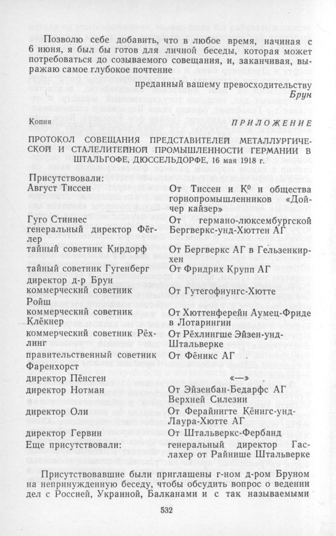 Приложение. Протокол совещания представителей металлургической и сталелитейной промышленности Германии в Штальгофе, Дюссельдорфе, 16 мая 1918 г. // Печат. пo DZAP.