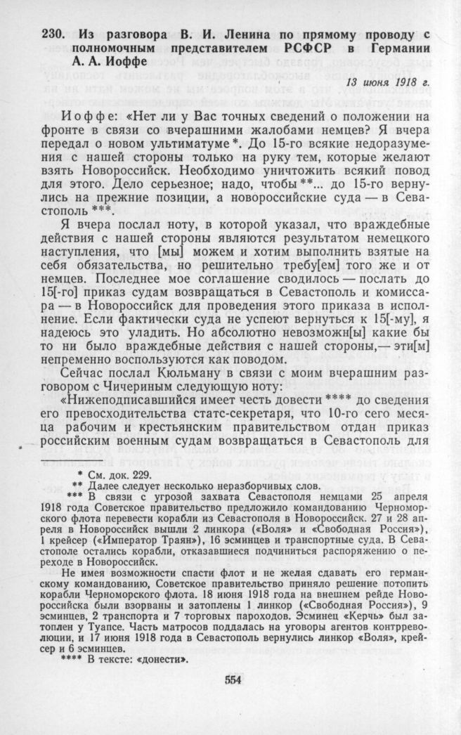 Из разговора В. И. Ленина по прямому проводу с полномочным представителем РСФСР в Германии А. А. Иоффе. 13 июня 1918 г. // «Документы внешней политики СССР», т. I. М., 1957, стр. 358— 360.