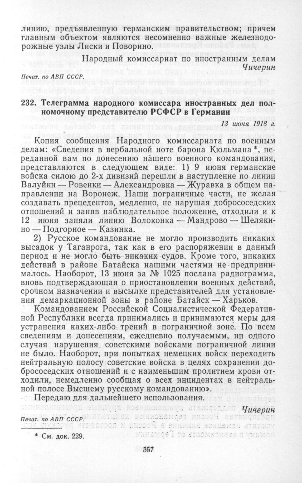Телеграмма народного комиссара иностранных дел полномочному представителю РСФСР в Германии. 13 июня 1918 г. // Печат. по АВП СССР.