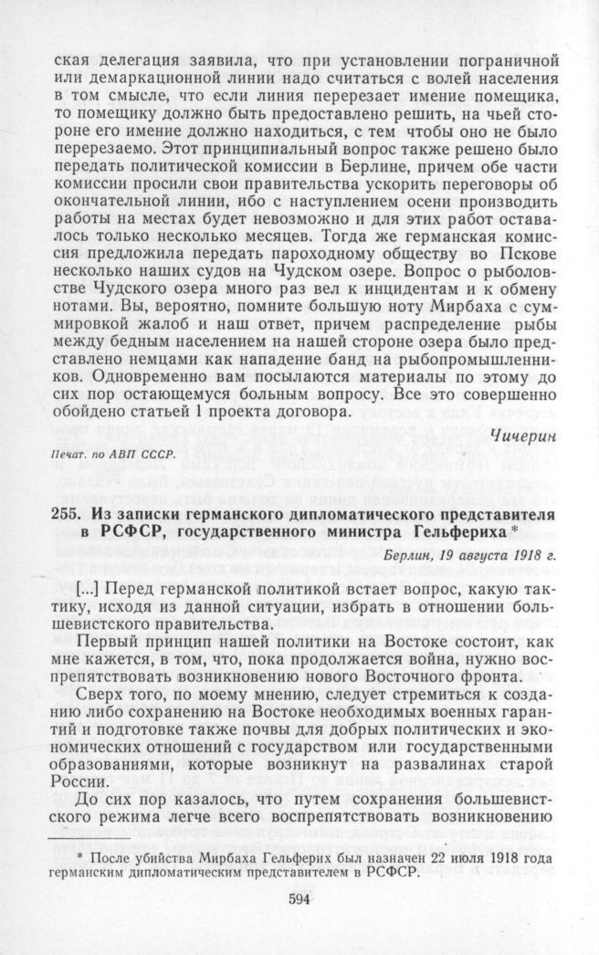 Из записки германского дипломатического представителя в РСФСР, государственного министра Гельфериха. Берлин, 19 августа 1918 г. // Печат. пo DZAP.