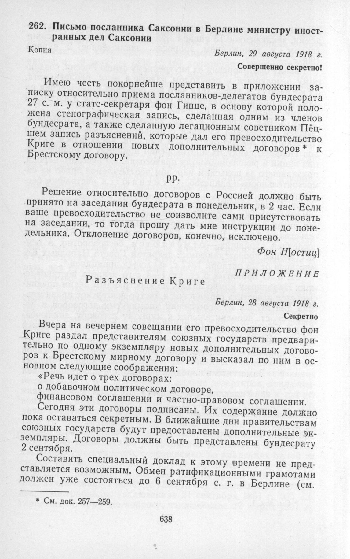 Письмо посланника Саксонии в Берлине министру иностранных дел Саксонии. Берлин, 29 августа 1918 г. // Печат. пo SLHAD.