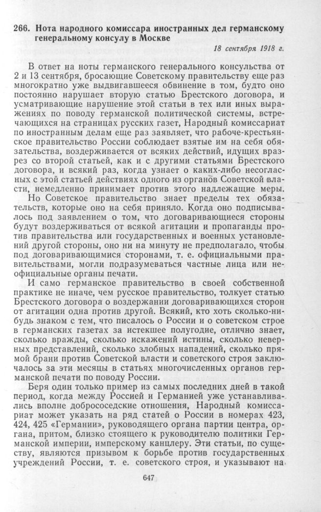 Нота народного комиссара иностранных дел германскому генеральному консулу в Москве. 18 сентября 1918 г. // Печат. по АВП СССР.