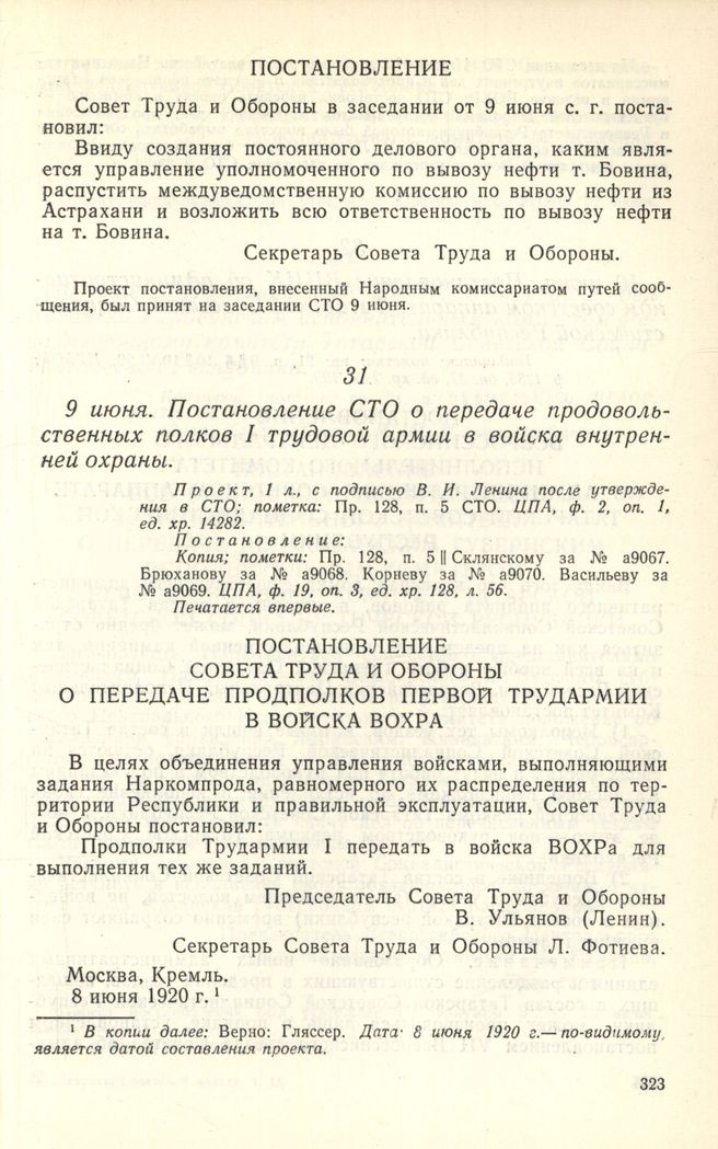9 июня. Постановление СТО о передаче продовольственных полков I трудовой армии в войска внутренней охраны // Проект, 1 л., с подписью В. И. Ленина после утверждения в СТО; пометка: Пр. 128, п. 5 СТО. ЦПА, ф. 2, оп. 1, ед. хр. 14282. Постановление: Копия; пометки: Пр. 128, п. 5 || Склянскому за № а9067. Брюханову за № а9068. Корневу за № а9070. Васильеву за № а9069. ЦПА, ф. 19, оп. 3, ед. хр. 128, л. 56. Печатается впервые.