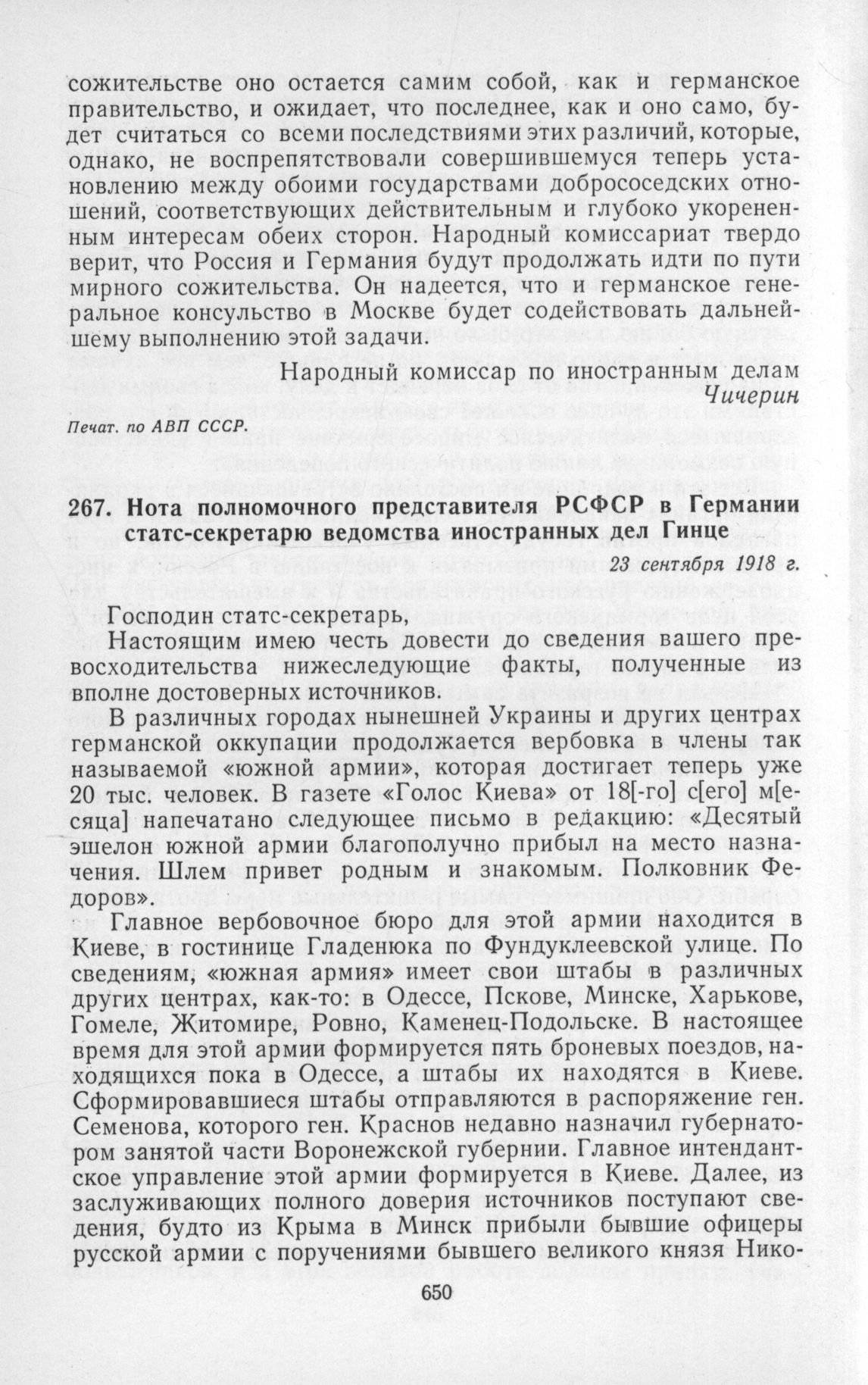 Нота полномочного представителя РСФСР в Германии статс-секретарю ведомства иностранных дел Гинце. 23 сентября 1918 г. // «Известия» № 211 (475), 29 сентября 1918 г.