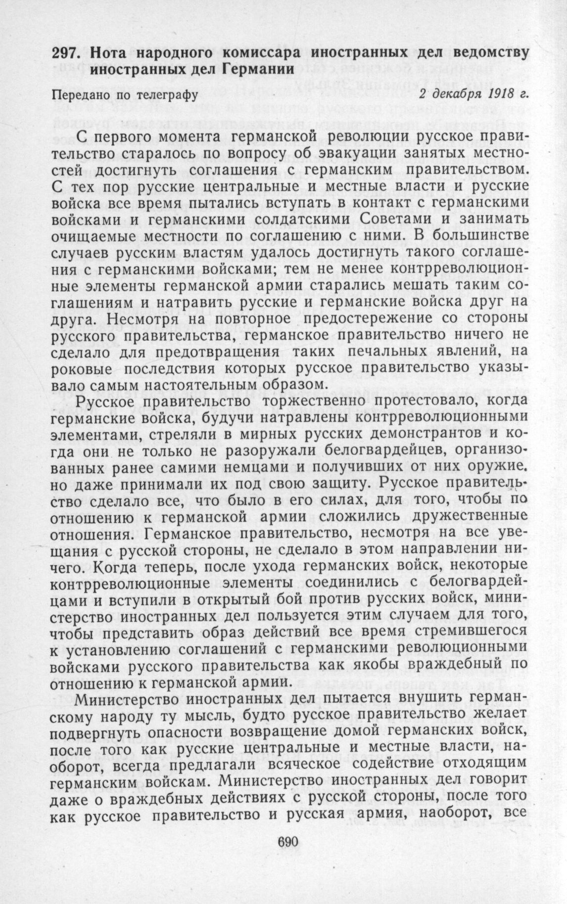 Нота народного комиссара иностранных дел ведомству иностранных дел Германии. 2 декабря 1918 г. // Печат. по АВП СССР.; «Известия» № 264 (528), 3 декабря 1918 г.