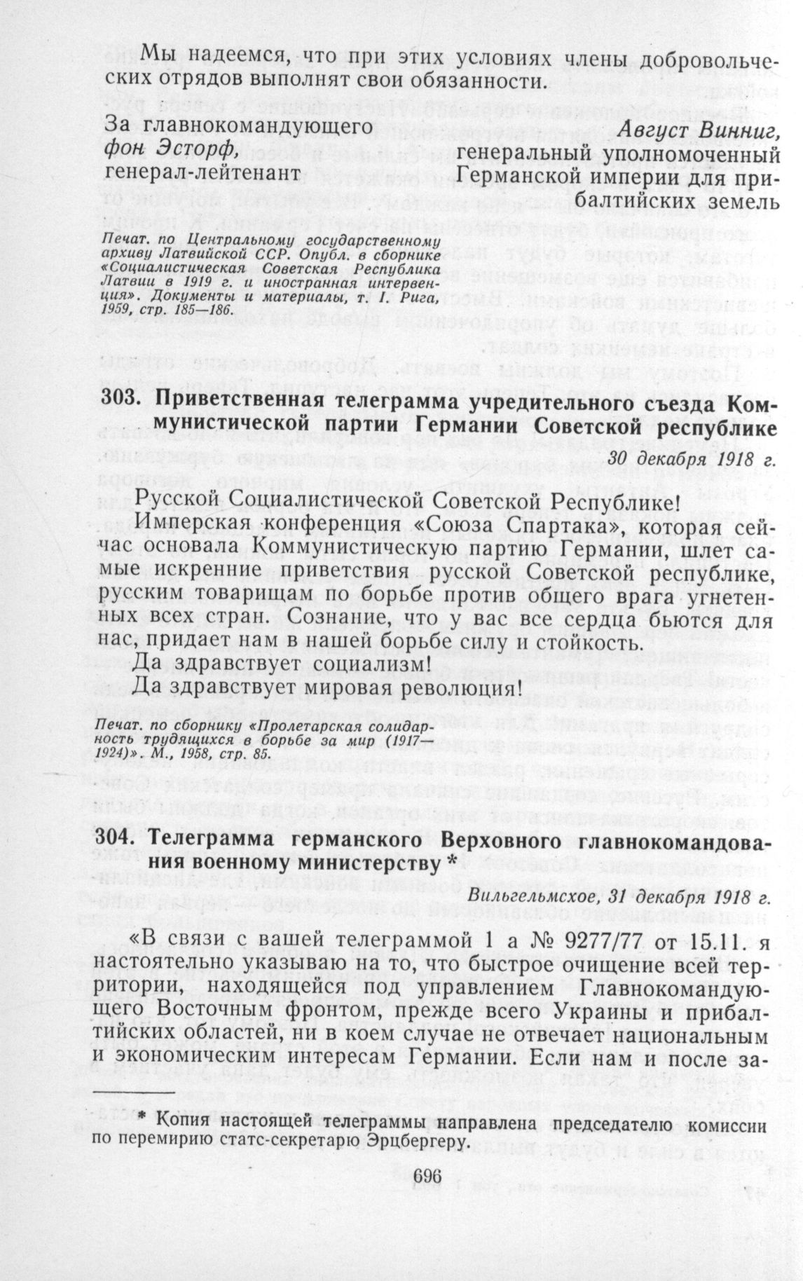 Приветственная телеграмма учредительного съезда Коммунистической партии Германии Советской республике. 30 декабря 1918 г. // «Пролетарская солидарность трудящихся в борьбе за мир (1917— 1924)». М., 1958, стр. 85.