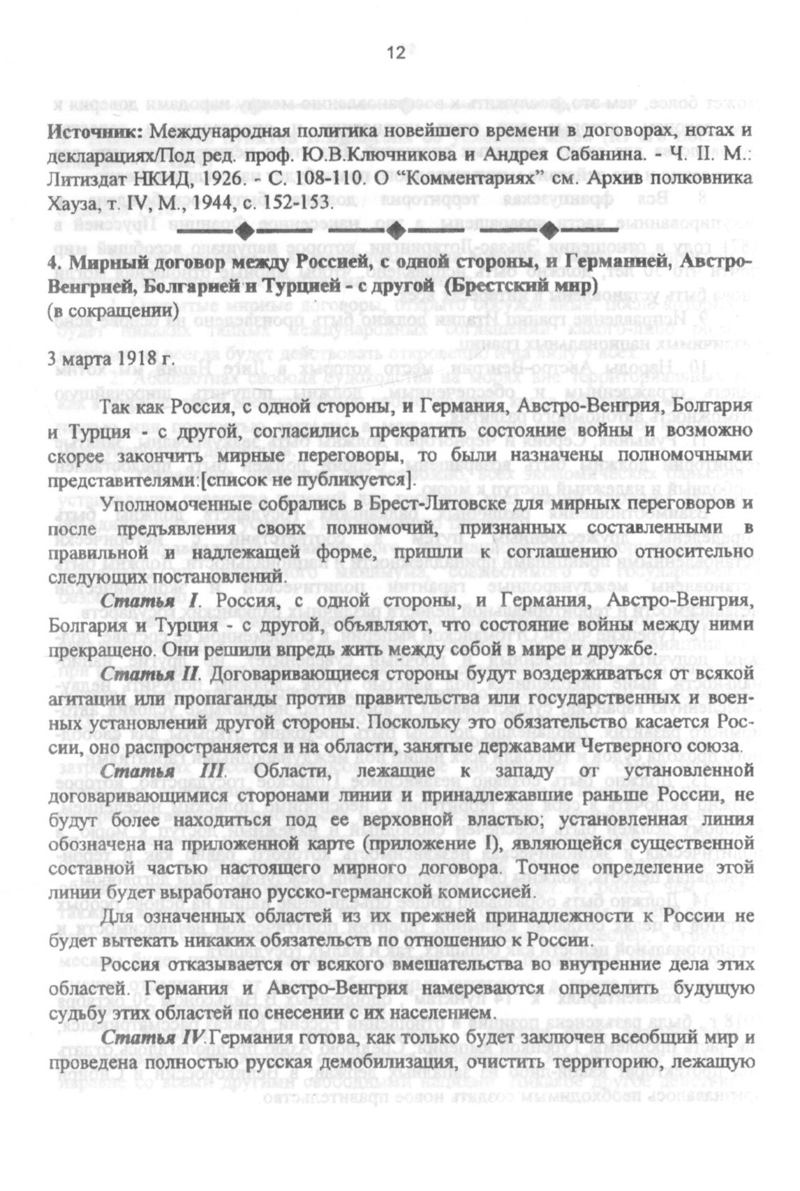 Мирный договор между Россией, с одной стороны, и Германией, Австро-Венгрией, Болгарией и Турцией - с другой (Брестский мир) (в сокращении). 3 марта 1918 г. // Документы внешней политики СССР. Том первый - М.: Госполитиздат, 1957,- С. 119-124.