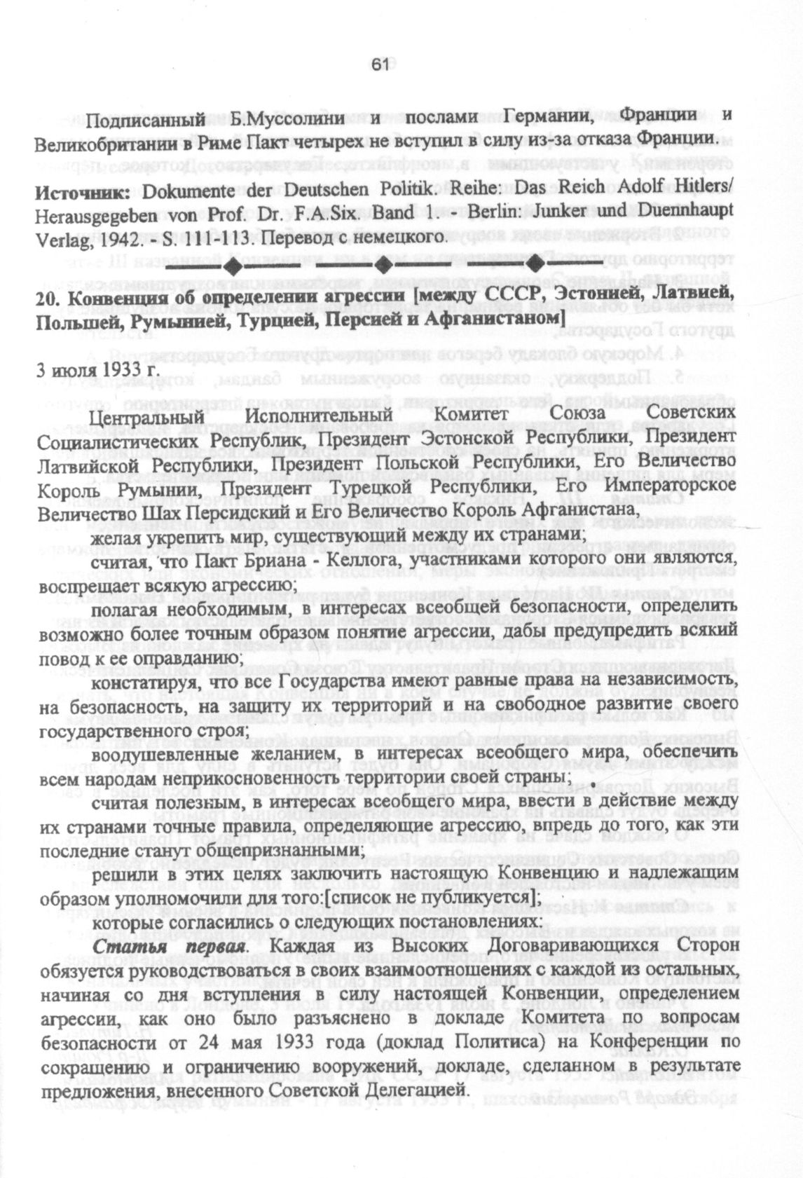 Конвенция об определении агрессии [между СССР, Эстонией, Латвией, Польшей, Румынией, Турцией, Персией и Афганистаном]. 3 июля 1933 г. // Документы внешней политики СССР. Том шестнадцатый. - М: Политиздат, 1970. - С. 388-392.
