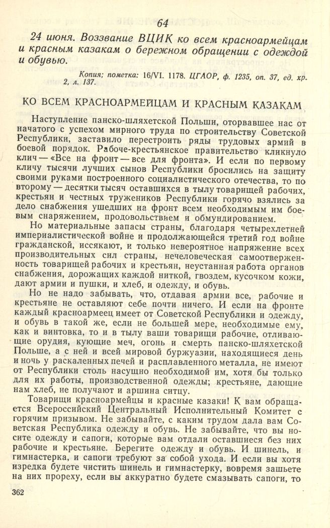 24 июня. Воззвание ВЦИК ко всем красноармейцам и красным казакам о бережном обращении с одеждой и обувью // Копия; пометка: 16/VI. 1178. ЦГАОР, ф. 1235, оп. 37, ед. хр. 2, л. 137.