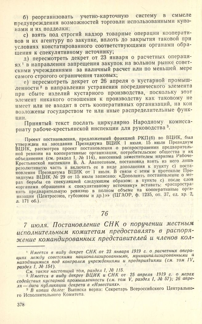 7 июля. Постановление СНК о поручении местным исполнительным комитетам предоставлять в распоряжение командированных представителей и членов коллегий народных комиссариатов средства передвижения для разъездов по городу и уезду // Подлинник; на бланке: Российская Социалистическая Федеративная Советская Республика. Совет Народных Комиссаров. Москва, Кремль, с датой и номером: 8/VII 1920 г. № а10810; пометки: В Президиум ВЦИК || Пр. № 509, п. 10 || Архив; гербовая печать: Российская Социалистическая Федеративная Советская Республика. Совет Народных Комиссаров. ЦГАОР. ф. 1235, оп. 95, ед. хр. 41, л. 175. Печатается впервые.