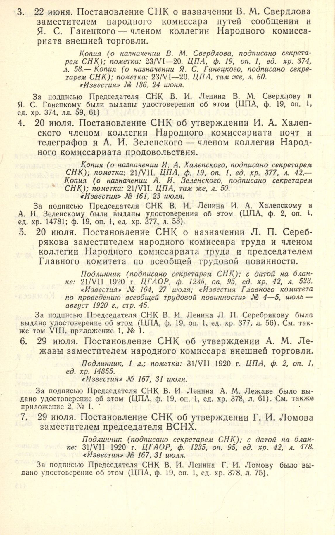 22 июня. Постановление СНК о назначении В. М. Свердлова заместителем народного комиссара путей сообщения и Я. С. Ганецкого — членом коллегии Народного комиссариата внешней торговли // Копия (о назначении В. М. Свердлова, подписано секретарем СНК); пометка: 23/VI—20. ЦПА, ф. 19, оп. 1, ед. хр. 374, л. 58.— Копия (о назначении Я. С. Ганецкого, подписано секретарем СНК); пометка: 23/VI—20. ЦПА, там же, л. 60. «Известия» № 136, 24 июня.