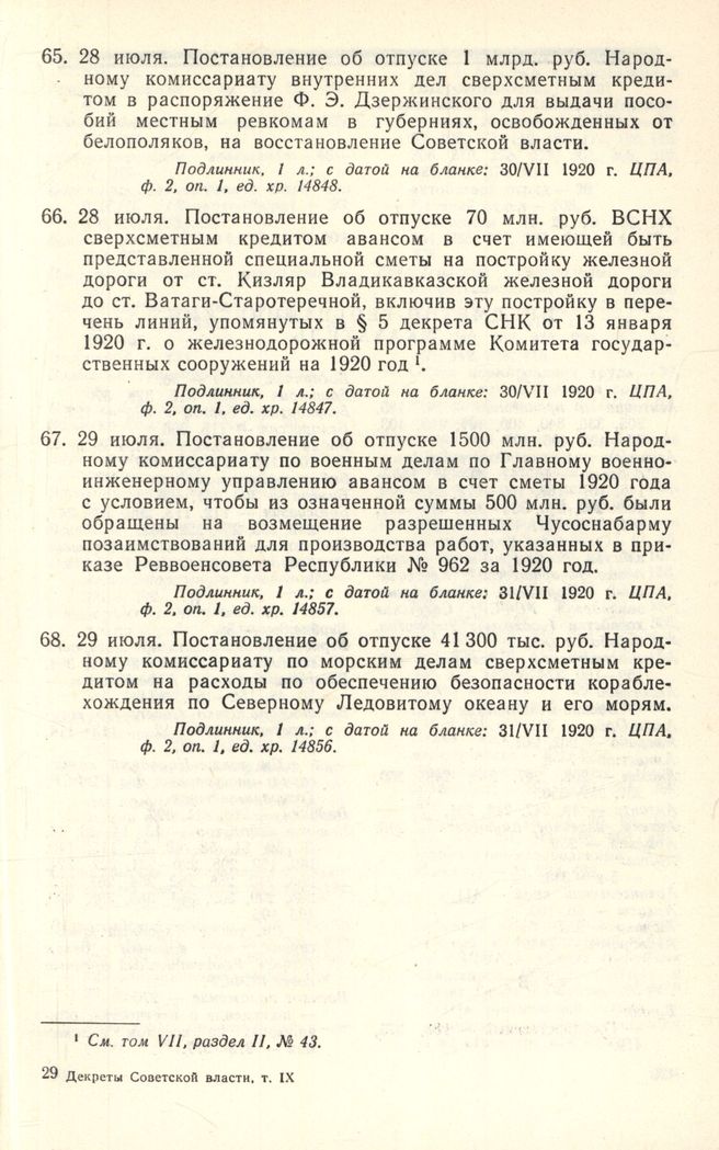 28 июля. Постановление об отпуске 1 млрд. руб. Народному комиссариату внутренних дел сверхсметным кредитом в распоряжение Ф. Э. Дзержинского для выдачи пособий местным ревкомам в губерниях, освобожденных от белополяков, на восстановление Советской власти // Подлинник. 1 л.; с датой на бланке: 30/VII 1920 г. ЦПА, ф. 2, оп. 1, ед. хр. 14848.