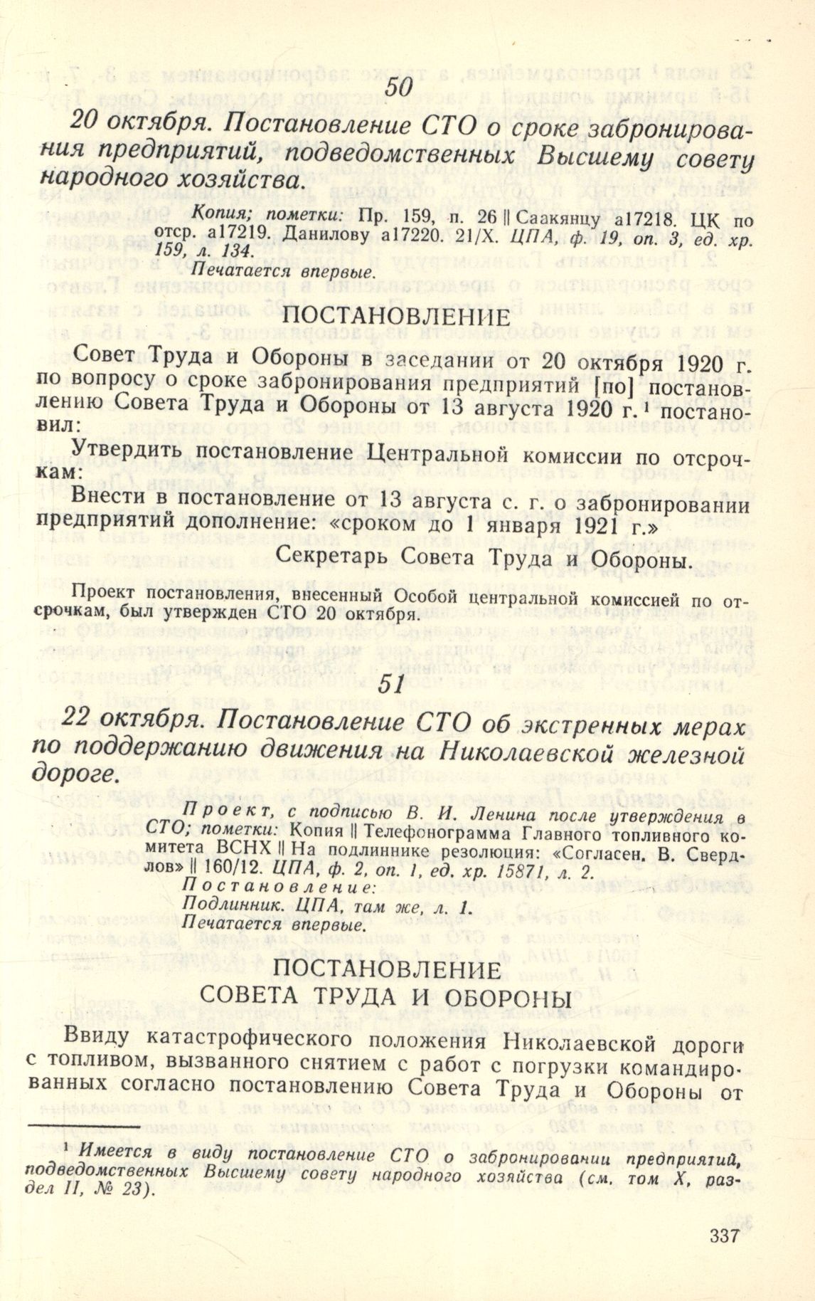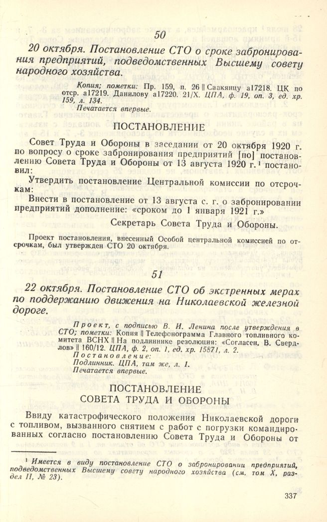 22 октября. Постановление СТО об экстренных мерах по поддержанию движения на Николаевской железной дороге // Проект, с подписью В. И. Ленина после утверждения в СТО; пометки: Копия II Телефонограмма Главного топливного комитета ВСНХ II На подлиннике резолюция: «Согласен. В. Свердлов» II 160/12. ЦПА, ф. 2, oп. 1, ед. хр. 15871, л. 2. Постановление: Подлинник. ЦПА, там же, л. 1. Печатается впервые.