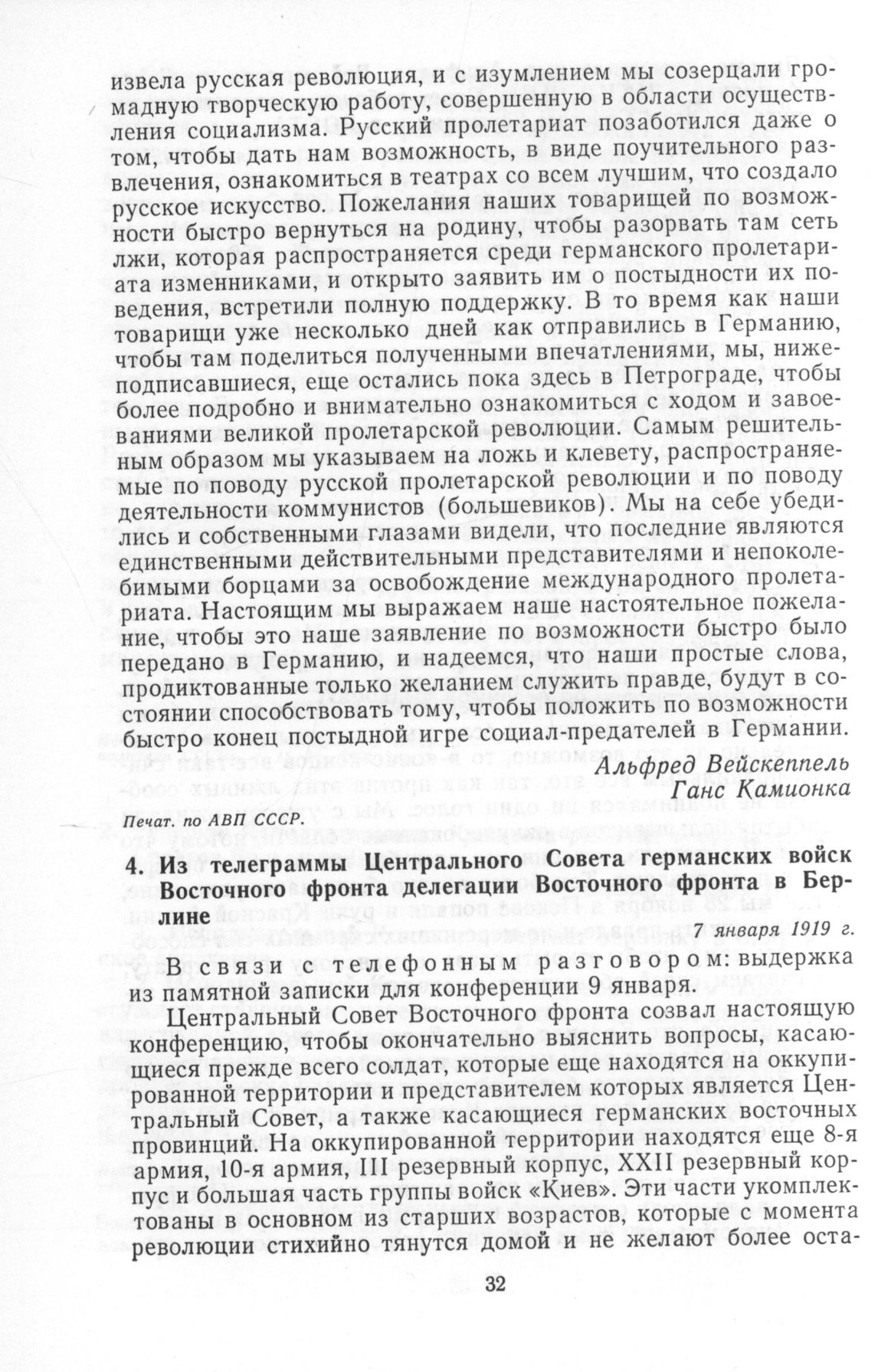 Из телеграммы Центрального Совета германских войск Восточного фронта делегации Восточного фронта в Берлине. 7 января 1919 г. // Печат. пo DZAP.