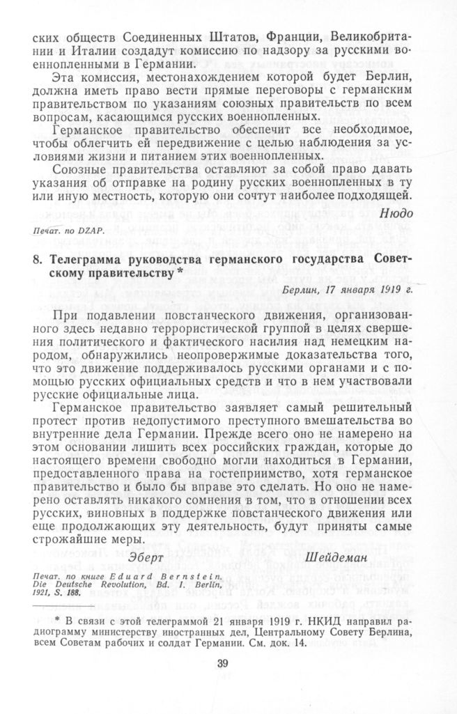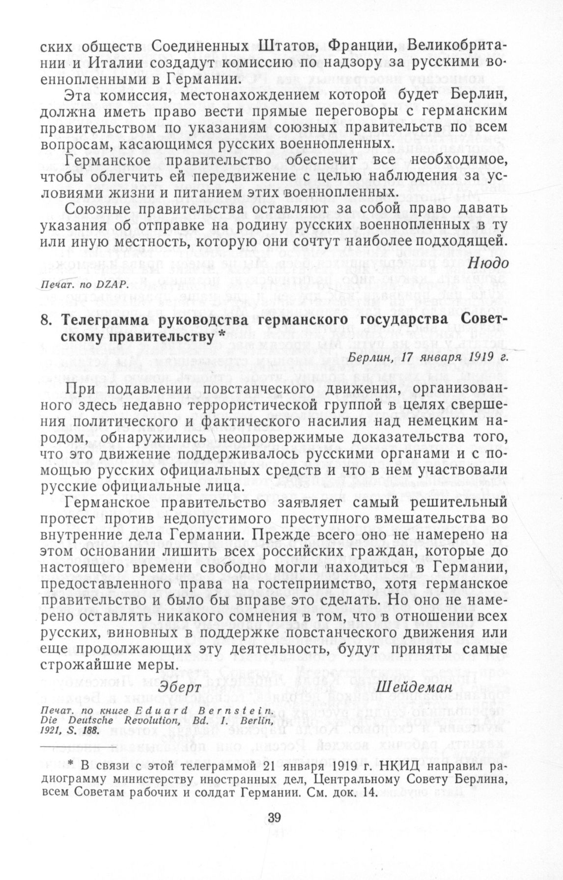 Телеграмма руководства германского государства Советскому правительству. Берлин, 17 января 1919 г. // Eduard Bernstein. Die Deutsche Revolution, Bd. I. Berlin, 1921, S. 188.