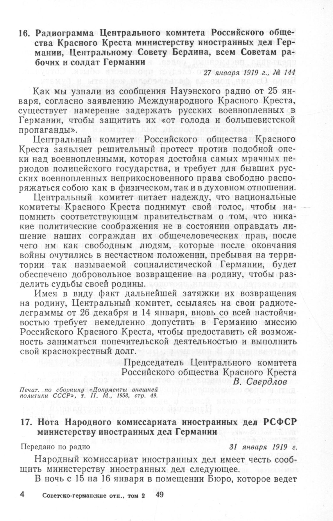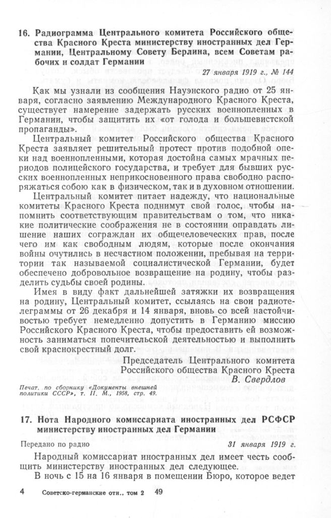 Нота Народного комиссариата иностранных дел РСФСР министерству иностранных дел Германии. 31 января 1919 г. // «Документы внешней политики СССР», т. II. М., 1958, стр. 55—56.