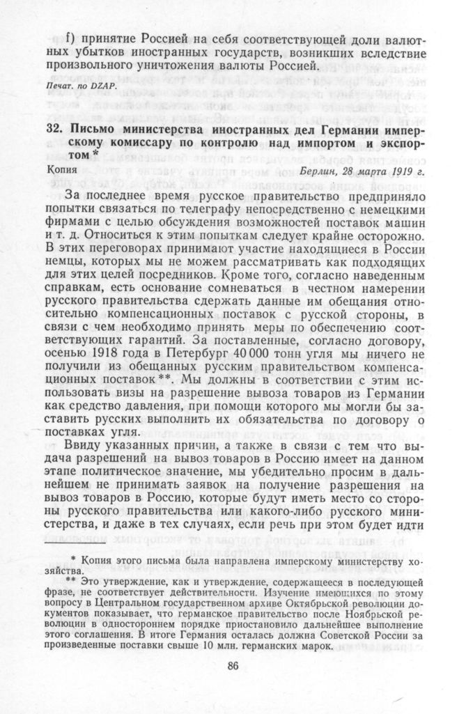 Письмо министерства иностранных дел Германии имперскому комиссару по контролю над импортом и экспортом. Берлин, 28 марта 1919 г. // Печат. пo DZAP.