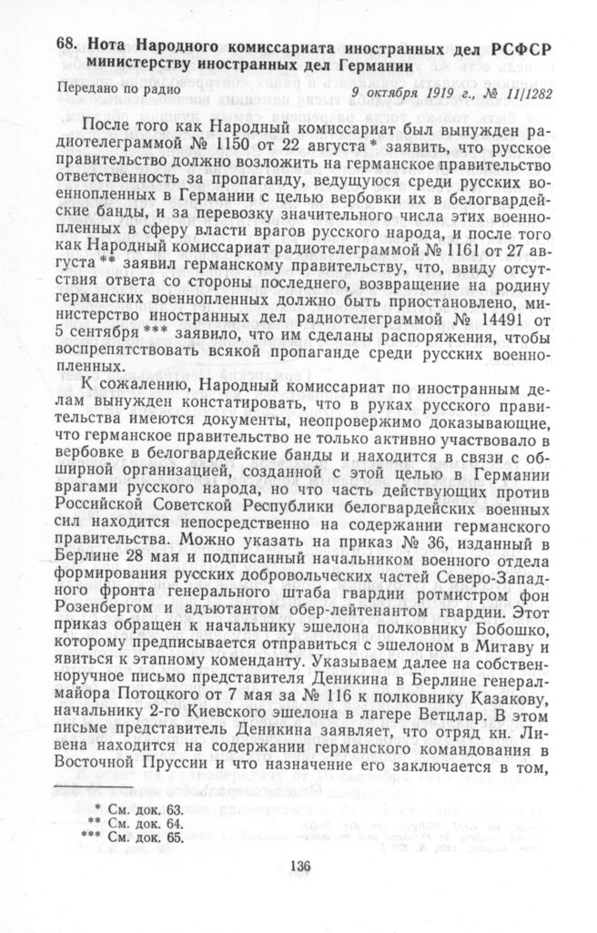Нота Народного комиссариата иностранных дел РСФСР министерству иностранных дел Германии. 9 октября 1919 г.