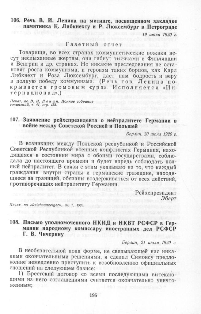 Советско-германские отношения от переговоров в Брест-Литовске до подписания Рапалльского договора: Сб.док. в 2 т. Т. 2. 1919-1922. — М.: Политиздат, 1971.