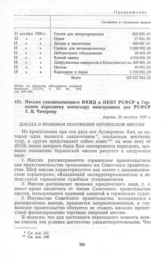 Письмо уполномоченного НКИД и НКВТ РСФСР в Германии народному комиссару иностранных дел РСФСР Г. В. Чичерину. Берлин, 20 октября 1920 г. // Печат. по АВП СССР.