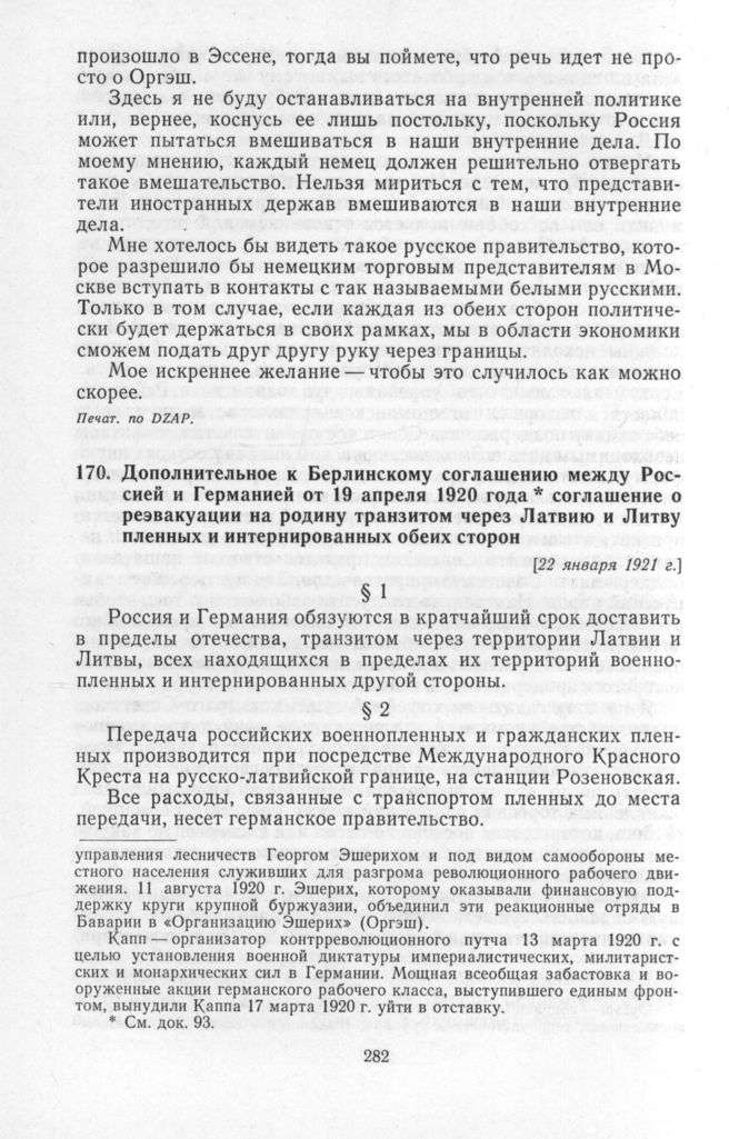 Дополнительное к Берлинскому соглашению между Россией и Германией от 19 апреля 1920 г. соглашение о реэвакуации на родину транзитом через Латвию и Литву пленных и интернированных обеих сторон. [22 января 1921 г.] // «Документы внешней политики СССР», т. III. М., 1954, стр. 489—490.