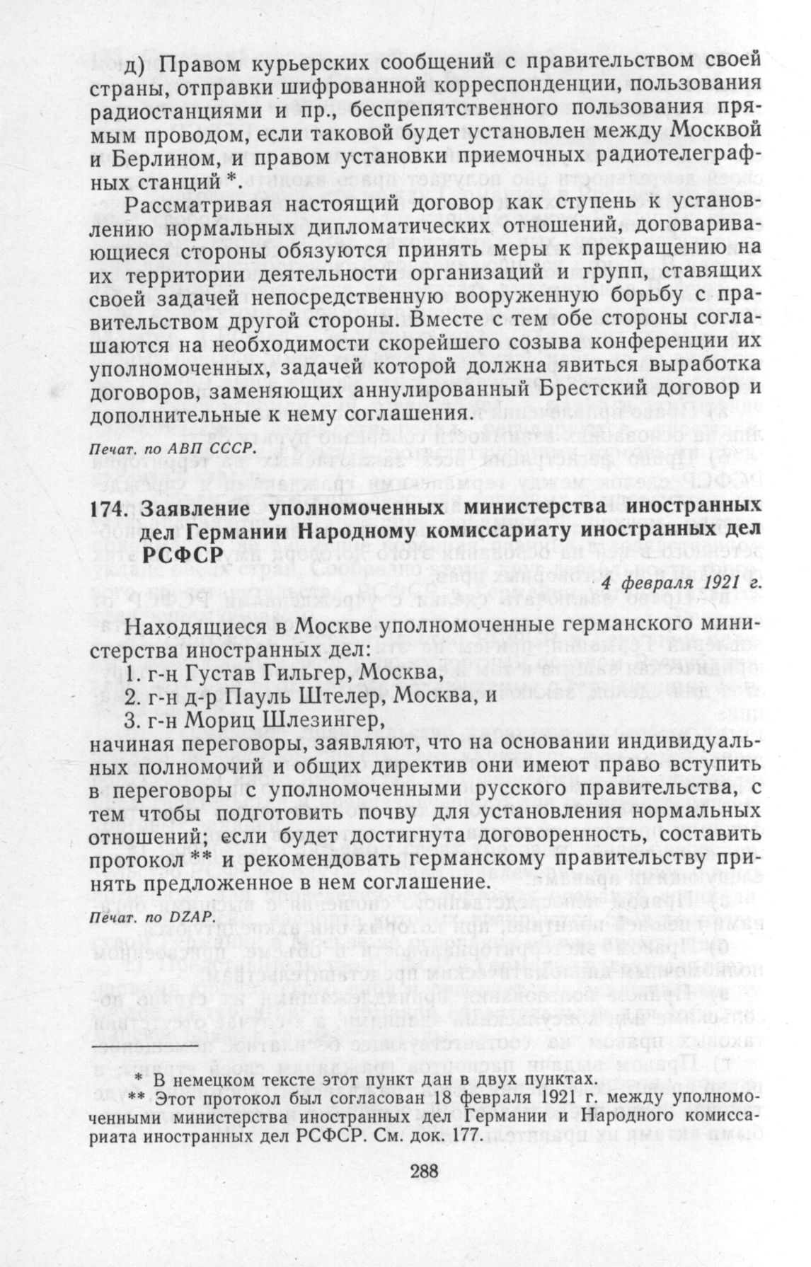 Заявление уполномоченных министерства иностранных дел Германии Народному комиссариату иностранных дел РСФСР. 4 февраля 1921 г. // Печат. пo DZAP.