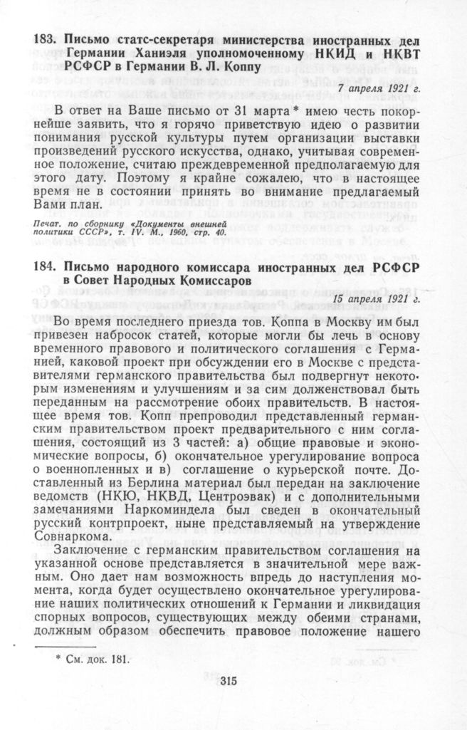 Советско-германские отношения от переговоров в Брест-Литовске до подписания Рапалльского договора: Сб.док. в 2 т. Т. 2. 1919-1922. — М.: Политиздат, 1971.