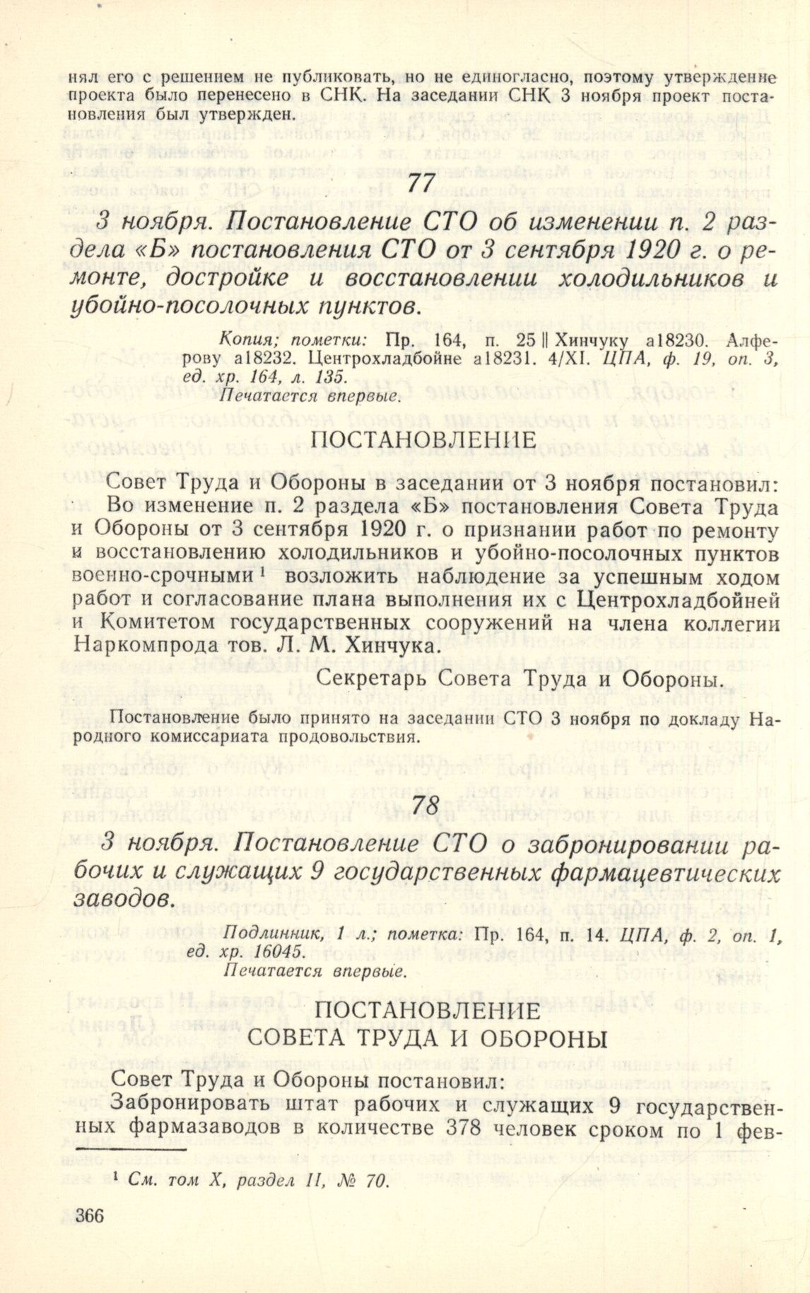 3 ноября. Постановление СТО об изменении п. 2 раздела «Б» постановления СТО от 3 сентября 1920 г. о ремонте, достройке и восстановлении холодильников и убойно-посолочных пунктов // Копия; пометки: Пр. 164, п. 25 || Хинчуку а18230. Алферову а18232. Центрохладбойне а 18231. 4/XI. ЦПА, ф. 19, oп. 3, ед. хр. 164, л. 135. Печатается впервые.