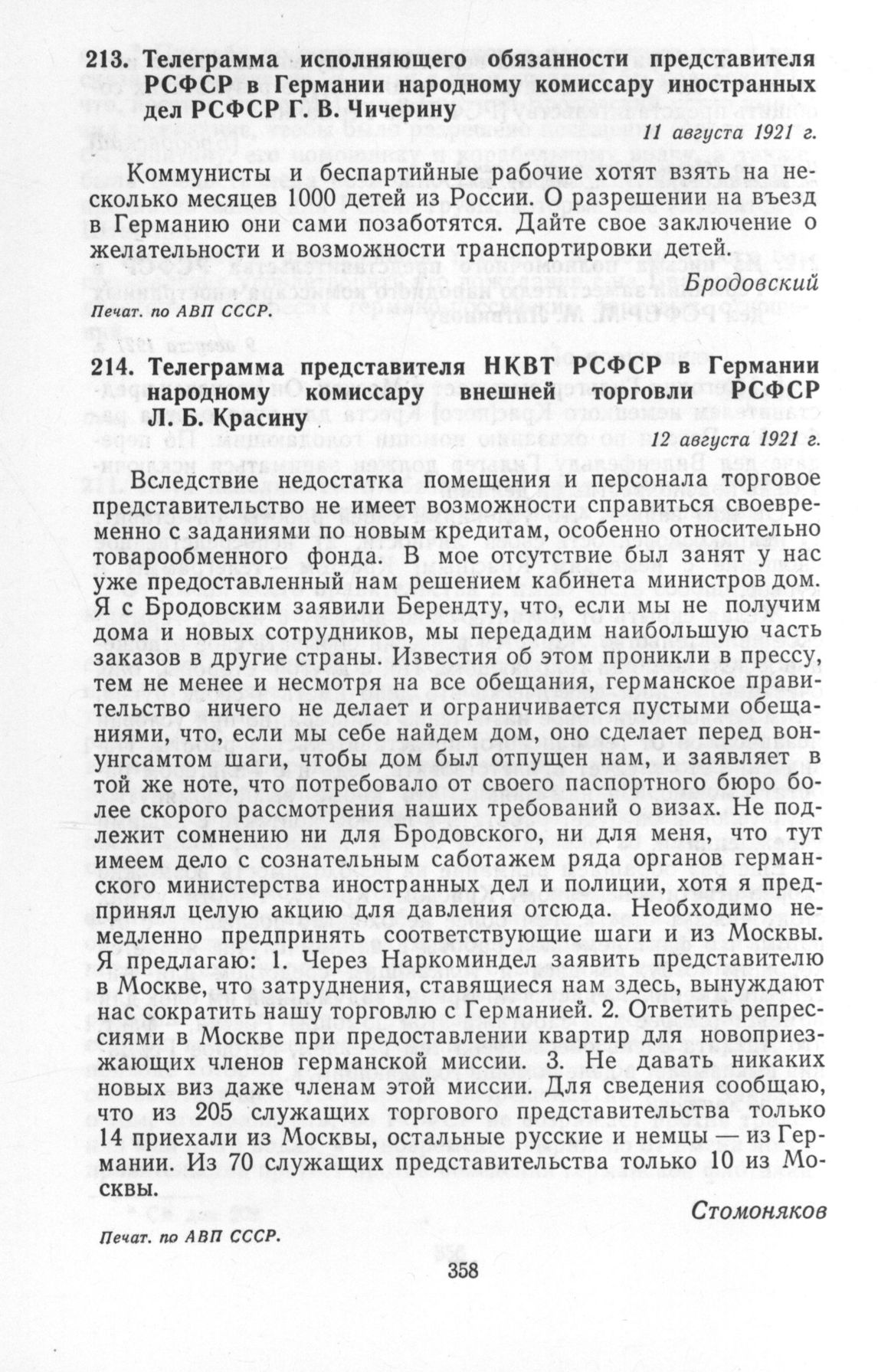 Телеграмма исполняющего обязанности представителя РСФСР в Германии народному комиссару иностранных дел РСФСР Г. В. Чичерину. 11 августа 1921 г. // Печат. по АВП СССР.