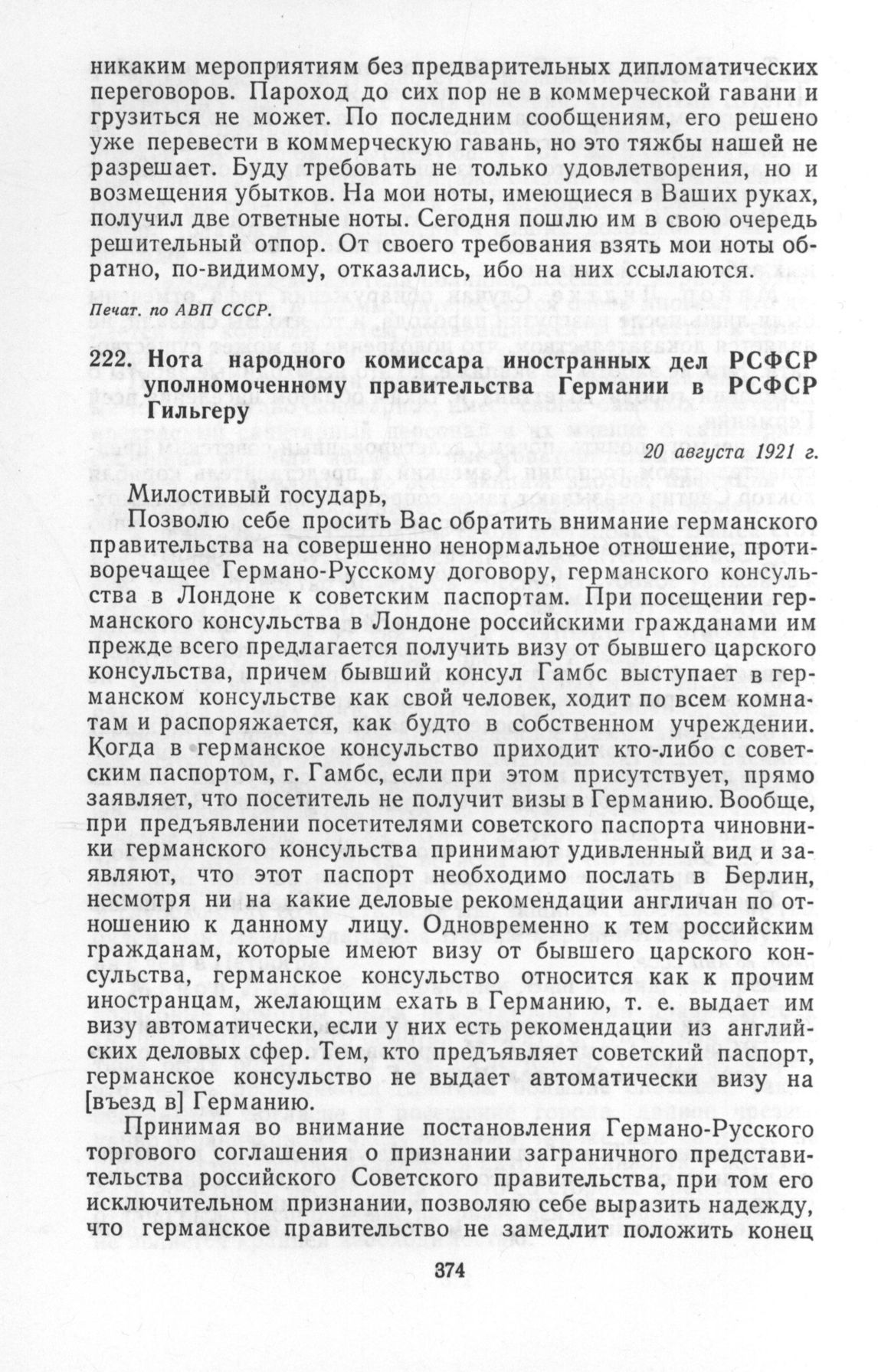 Нота народного комиссара иностранных дел РСФСР уполномоченному правительства Германии в РСФСР Гильгеру. 20 августа 1921 г. // «Документы внешней политики СССР», т. IV. М., 1960, стр. 286—287.