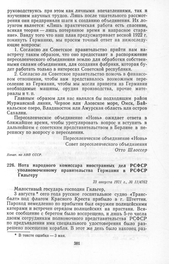 Нота народного комиссара иностранных дел РСФСР уполномоченному правительства Германии в РСФСР Гильгеру. 23 августа 1921 г. // «Документы внешней политики СССР», т. IV. М., 1960, стр. 291—292.