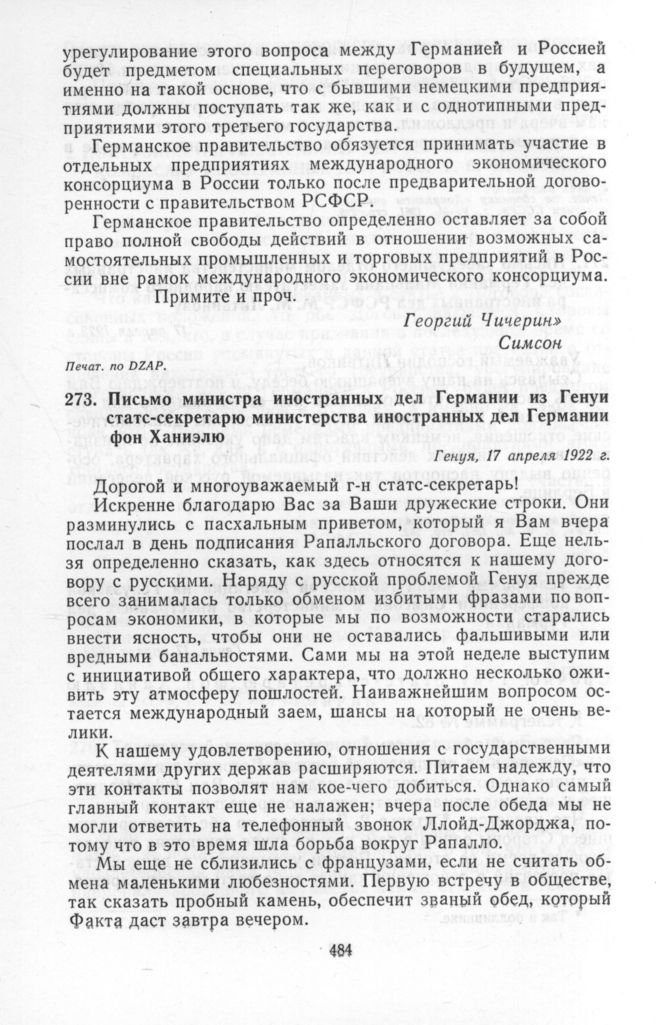 Письмо министра иностранных дел Германии из Генуи статс-секретарю министерства иностранных дел Германии фон Ханиэлю. Генуя, 17 апреля 1922 г.