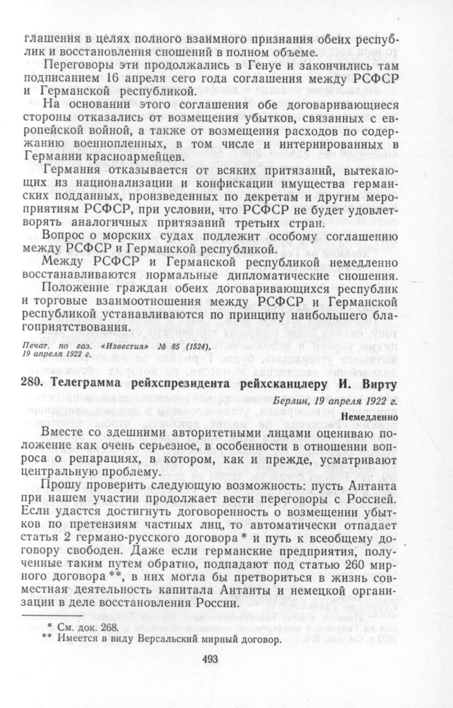 Телеграмма рейхспрезидента рейхсканцлеру И. Вирту. Берлин, 19 апреля 1922 г. // Печат. пo DZAP.