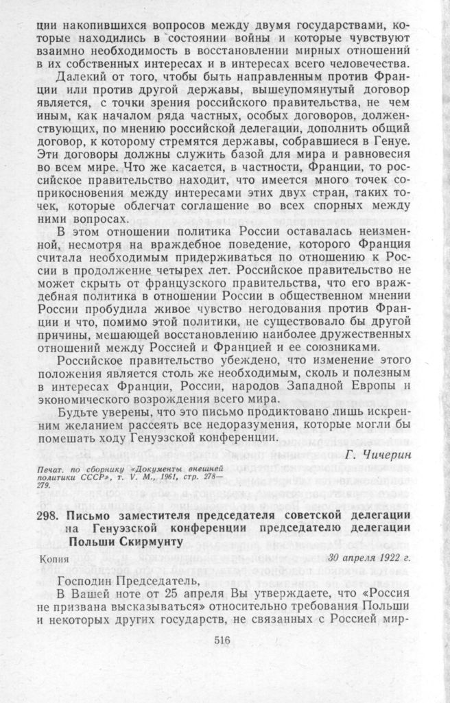 Письмо заместителя председателя советской делегации на Генуэзской конференции председателю делегации Польши Скирмунту. 30 апреля 1922 г. // «Документы внешней политики СССР», т. V. М., 1961, стр. 283—284.