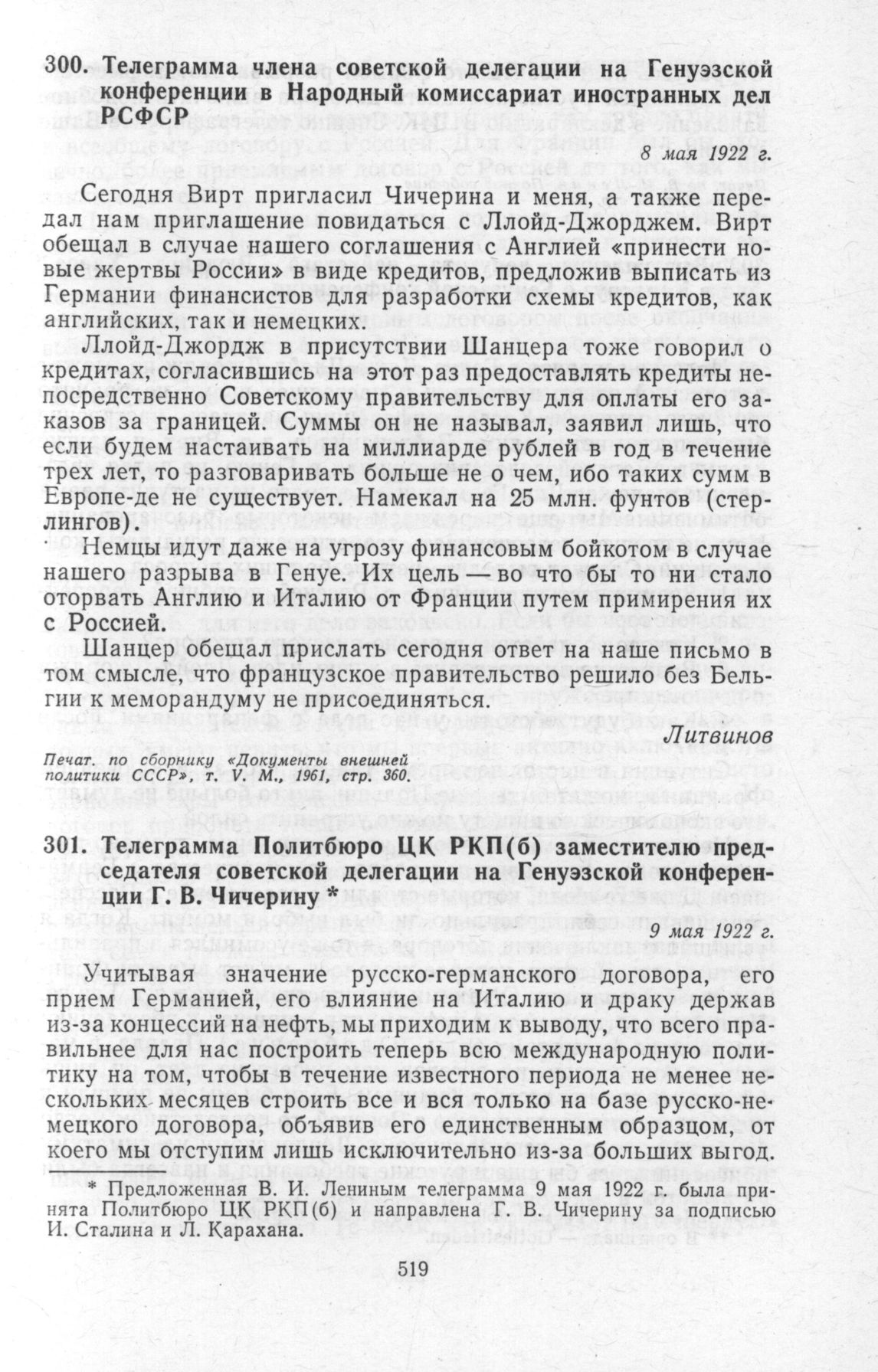 Телеграмма члена советской делегации на Генуэзской конференции в Народный комиссариат иностранных дел РСФСР. 8 мая 1922 г. // «Документы внешней политики СССР», т. V. М., 1961, стр. 360.
