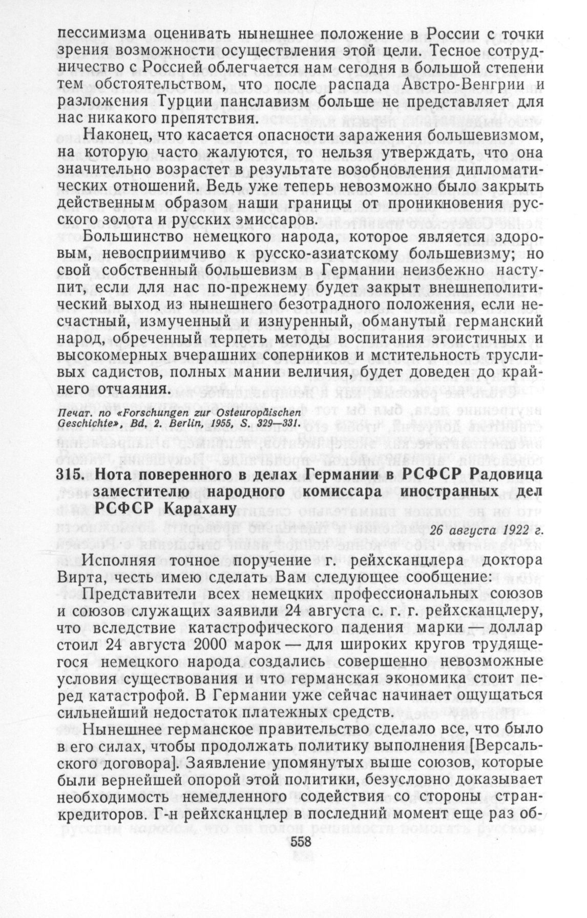 Нота поверенного в делах Германии в РСФСР Радовица заместителю народного комиссара иностранных дел РСФСР Карахану. 26 августа 1922 г. // «Документы внешней политики СССР», т. V. М., 1961, стр. 564—565.