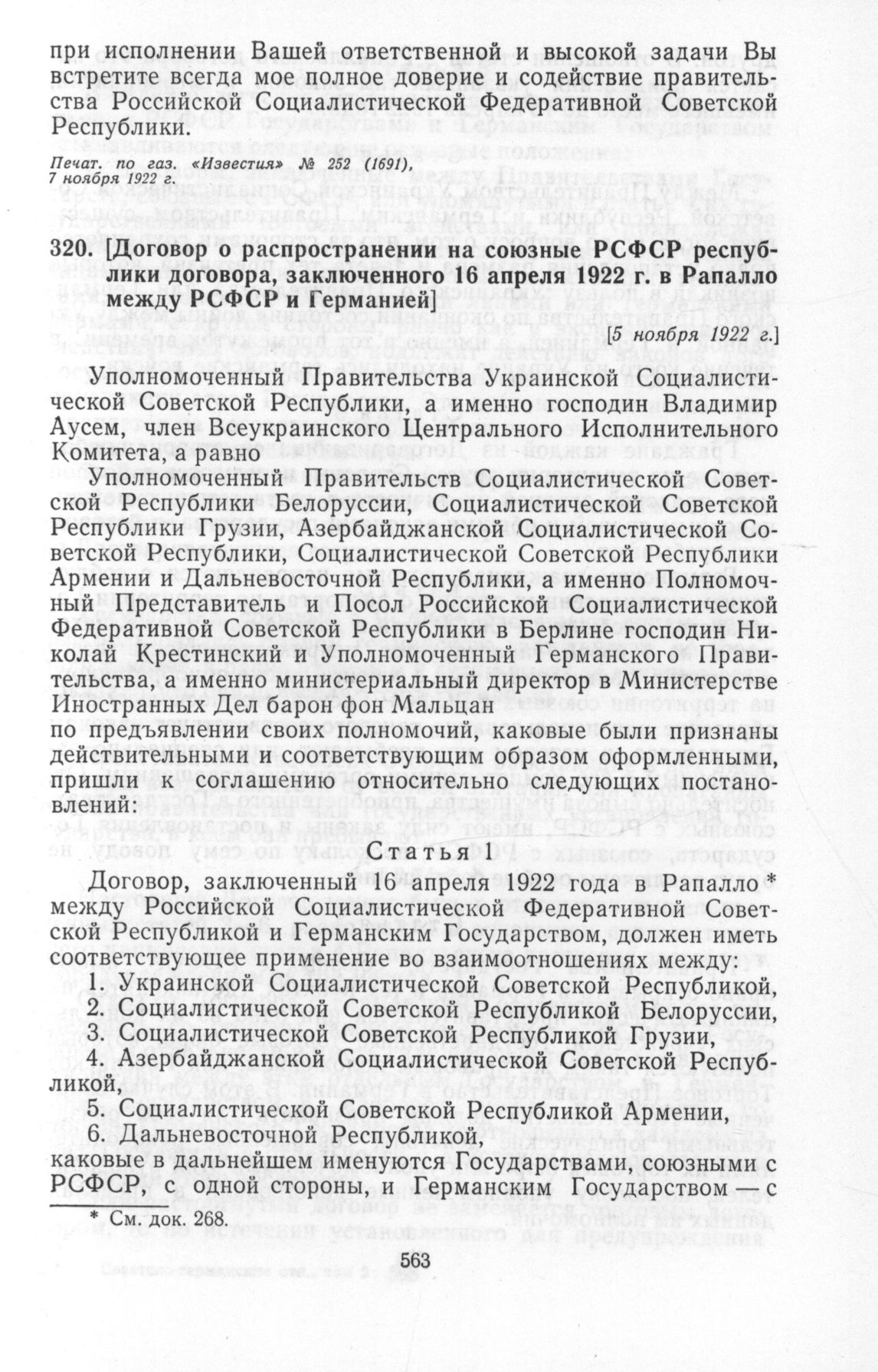 Договор о распространении на союзные РСФСР республики договора, заключенного 16 апреля 1922 г. в Рапалло между РСФСР и Германией. [5 ноября 1922 г.]