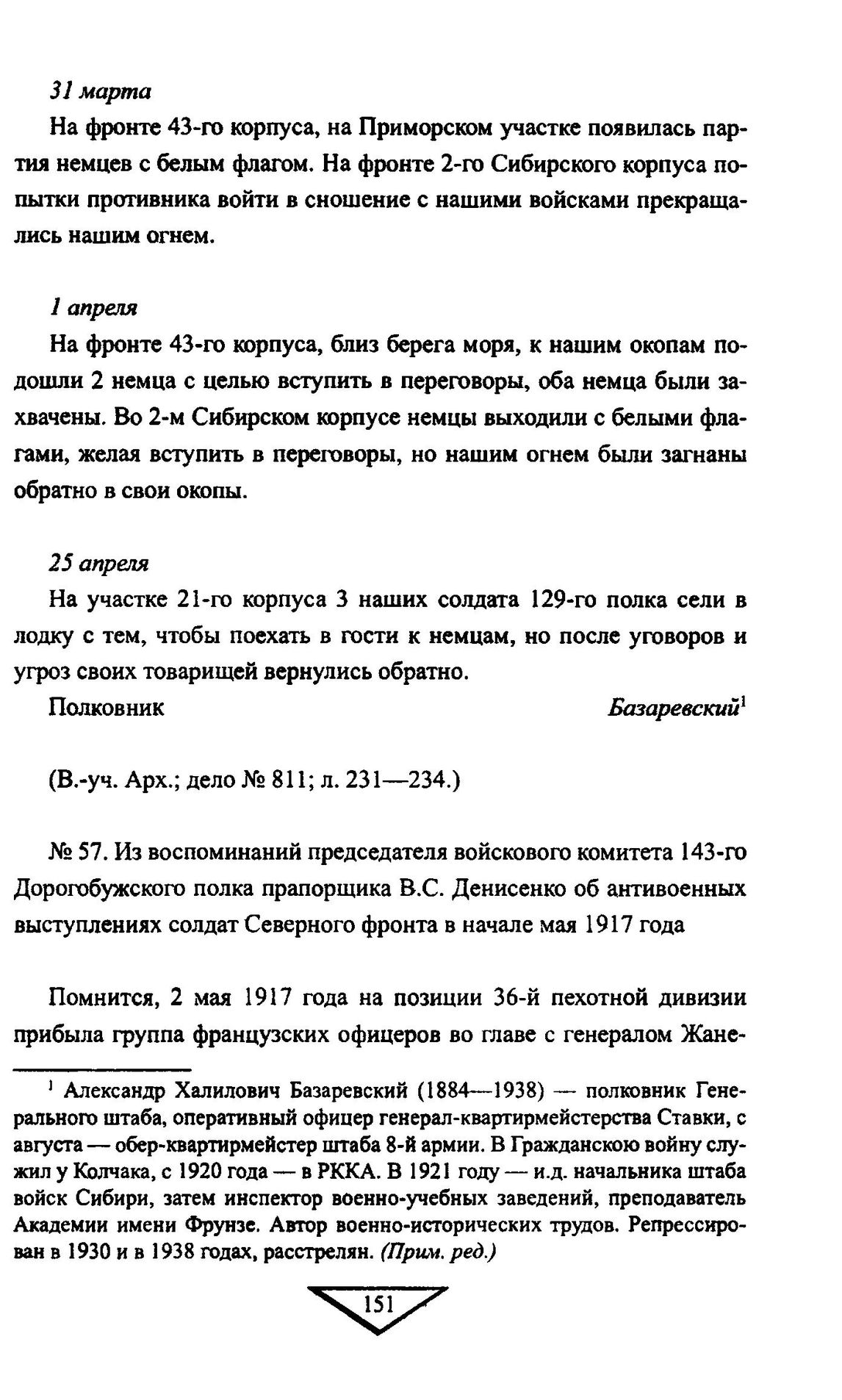 Из воспоминаний председателя войскового комитета 143-го Дорогобужского полка прапорщика В.С. Денисенко об антивоенных выступлениях солдат Северного фронта в начале мая 1917 года // Октябрь на фронте. Воспоминания. М.: Воениздат, 1967. С. 95—97.