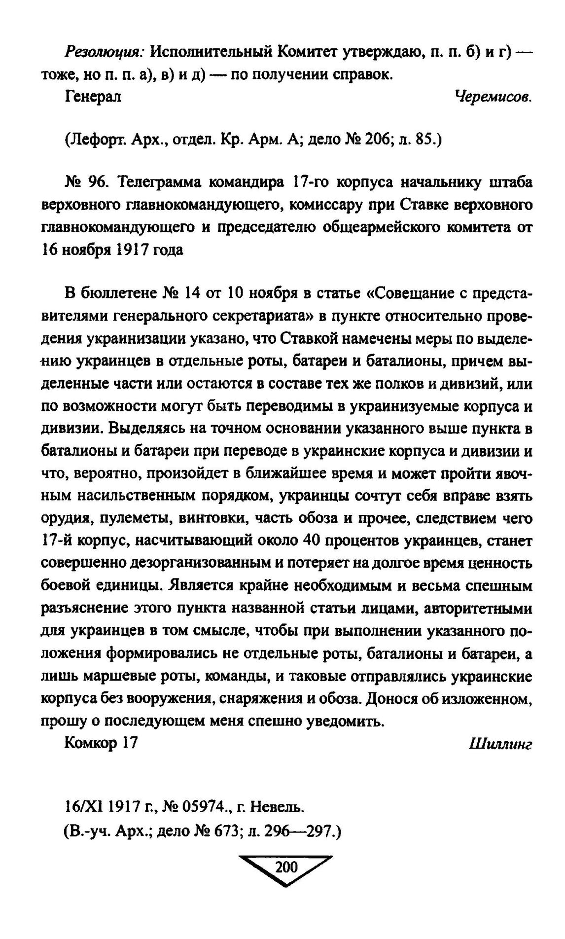 Телеграмма командира 17-го корпуса начальнику штаба верховного главнокомандующего, комиссару при Ставке верховного главнокомандующего и председателю общеармейского комитета от 16 ноября 1917 года // В.-уч. Арх.; дело № 673; л. 296—297.