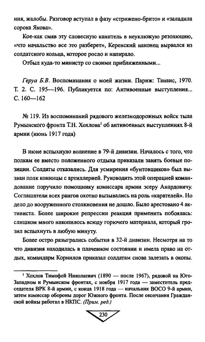 Из воспоминаний рядового железнодорожных войск тыла Румынского фронта Т.Н. Хохлова об антивоенных выступлениях 8-й армии (июнь 1917 года) // Октябрь на фронте. Воспоминания. М.: Воениздат, 1967. С. 223—224.